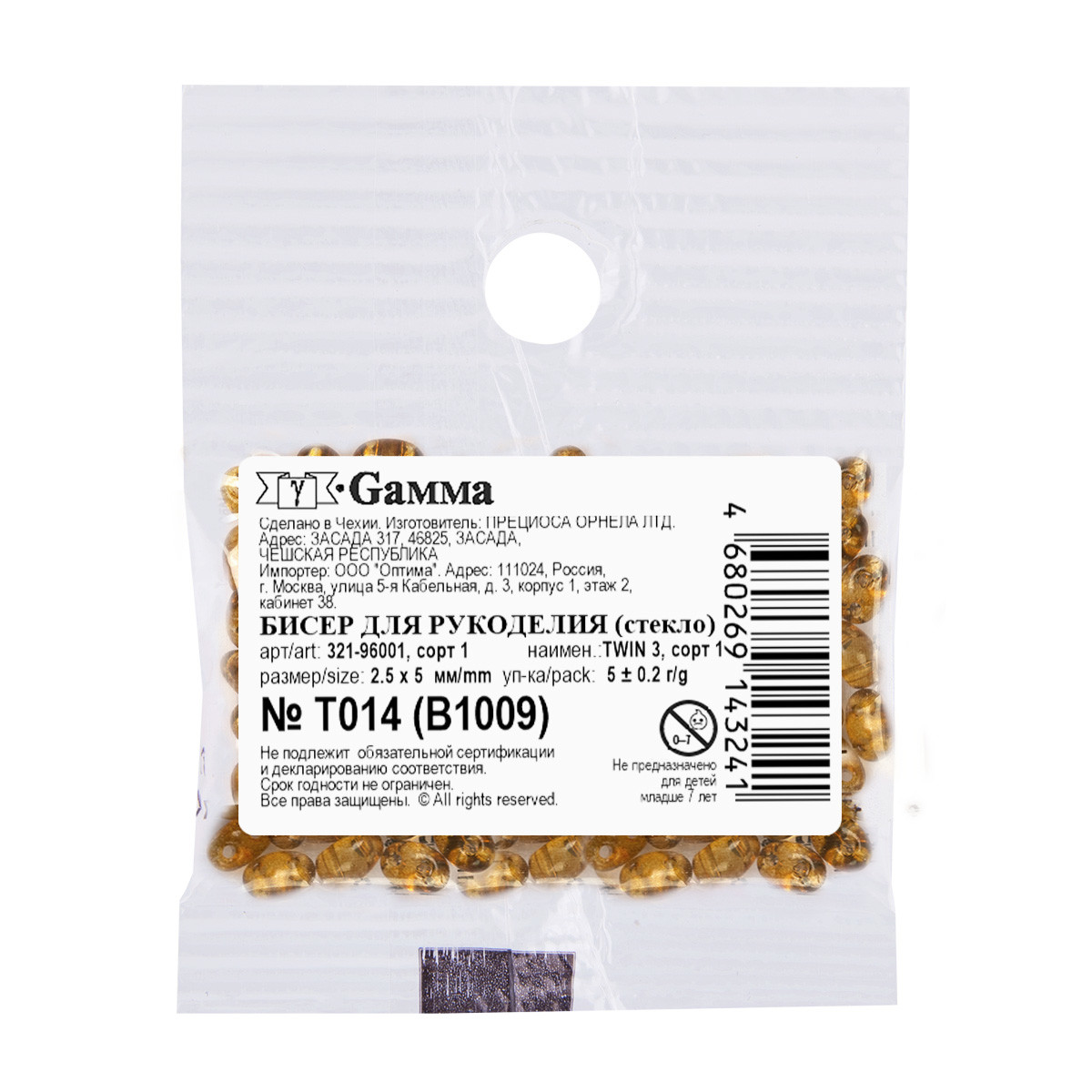 Бисер Чехия " GAMMA" TWIN 3 321- 96001 2. 5 x 5 мм 5 г 1- й сорт T013 янтарный ( B1003 )